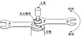 4. 與馬達(dá)的連接方法 注意 在主軸上安裝馬達(dá)時(shí),清掃連接部,安裝時(shí)注意不要將灰塵混入內(nèi)部。另外,安裝作業(yè)時(shí)手要干凈,否則臟手會(huì)將灰塵帶入內(nèi)部。 1,將馬達(dá)前部的螺絲對(duì)準(zhǔn)主軸后部的螺絲朝順時(shí)針?lè)较蜣D(zhuǎn)動(dòng)。如果旋轉(zhuǎn)傳動(dòng)用離合器未嚙合時(shí),與馬達(dá)連接的螺絲旋轉(zhuǎn)2圈就不能轉(zhuǎn)動(dòng),這時(shí),不可用力緊固,將螺絲稍微旋出后用手指轉(zhuǎn)動(dòng),使離合器嚙合后再擰螺絲,最后用附帶的27mm扳手緊固。 2,在夾頭螺母上套上附帶的14mm扳手朝逆時(shí)針?lè)较蜣D(zhuǎn)動(dòng),夾頭松動(dòng)后取下工具。(轉(zhuǎn)動(dòng)約1圈夾頭螺母可緊固1次,再次轉(zhuǎn)動(dòng)后夾頭被打開(kāi)。) 3,插入另外的工具,將夾頭朝順時(shí)針?lè)较蜣D(zhuǎn)動(dòng)使工具固定。