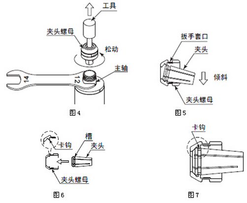 6. 夾頭的更換方法 注意 把夾頭裝到夾頭螺母上的時(shí)候,請(qǐng)保證使夾頭槽準(zhǔn)確地進(jìn)入螺母卡鉤。否則在擰緊螺母后,有時(shí)夾頭會(huì)留在主軸內(nèi),無(wú)法取出。 1, 按照“5. 工具的更換方法”在插入工具的狀態(tài)下松動(dòng)夾頭螺母,轉(zhuǎn)動(dòng)夾頭螺母直至從主軸上脫落為止,與工具一起從主軸上拔下。然后,再將工具從夾頭上取下。(圖-4) 2,用手拿住夾頭螺母,將夾頭朝扳手套口方向傾斜的話,夾頭就能取下。如果不能取下夾頭時(shí),可將夾頭朝另一個(gè)扳手套口方向傾斜。(圖-5) 3,安裝夾頭的時(shí)候,手持夾頭螺母,安裝夾頭(圖- 6)。