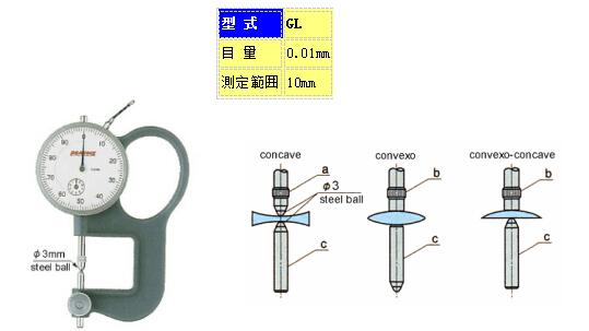 ② 鏡片厚薄表GL型:GL厚薄表可以測量凹形,凸形和凹凸型鏡片的厚度,改換測頭和測砧還可測量其他類型鏡片的厚度。